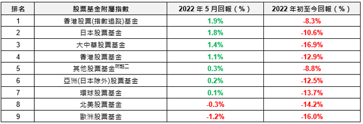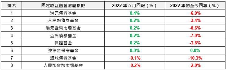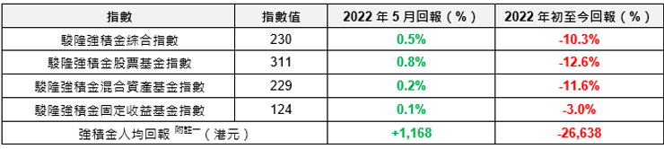 *所有基金指數的升幅均按資產比重,以點對點回報增長來計算。5月份的回報,數據由2022年5月1日至5月31日為止。
