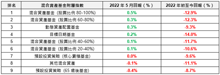 表三:混合資產基金附屬指數表現排名(按5月回報排序)